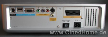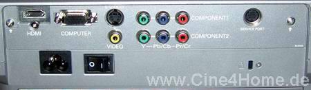 Schlusslicht in Sachen Eingängen ist diesmal der Sony VPLHS60. Er bietet ebenfalls keinen zweiten analogen Komponenteneingang, zudem fehlt ihm auch eine serielle Schnittstelle.