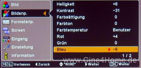Der Blauüberschuss sorgt für ein leicht zu kühles Bild auf der Leinwand. Den dritten Platz sichert sich der TX200 vor allem durch sein hervorragendes RGB-Menü. In ihm können die Grundfarben getrennt für helle, dunkle und mittlere Bereiche justiert werden.