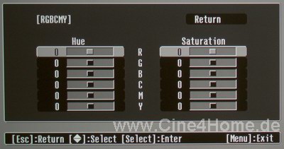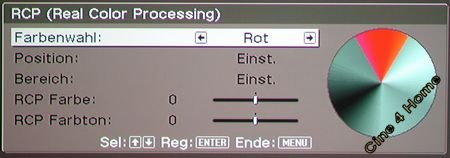 Mit Hilfe der "Real-Color-Processing" oder "RGBCMY"-Menüs lassen sich bei beiden Projektoren perfekte Farbräume in Bezug auf die Videonorm (PAL oder NTSC) erreichen. Bei beiden Projektoren können die Einstellwerte zudem praktisch abgespeichert und abgerufen werden.