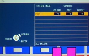 3 Punkte: Panasonic PT-AE900, Sanyo PLV-Z4 Auch die Panasonic- und Sanyo Konzepte bieten Einstellsysteme für den Farbraum, doch ihre Arbeitsweise ist nicht so komfortabel, nicht so präzise und auch noch nicht konsequent logisch. Mit relativ umständlichen Profilen, Zielkreuzen etc. muss hier der Anwender "jonglieren" und resultierende Mischfarben werden nicht unbedingt so beeinflusst, wie es bei einer Farbraumkorrektur der Fall sein sollte.