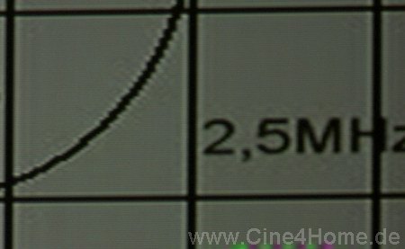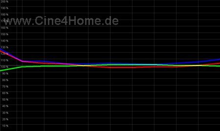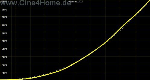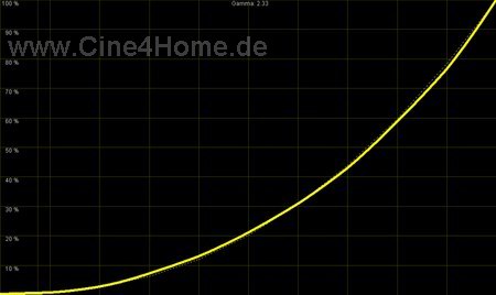 Der Gammaverlauf des in den Farben präzisen "Cinema 1"-Modus fällt mit einem gleichmäßigen Anstieg von 2,33 universell nutzbar aus. Damit ist der Projektor für die meisten Räume gut gewappnet, eine nachträgliche Anpassung ist aber durch den unpräzise arbeitenden Gamma-Manager, der eigentlich nur zwei Einstellbereiche zulässt (der dritte beeinflusst den Weißpegel), nur bedingt möglich. Hier verschenkt der Projektor ein wenig seines sonst so hervorragenden Kontrast-Potenzials.
