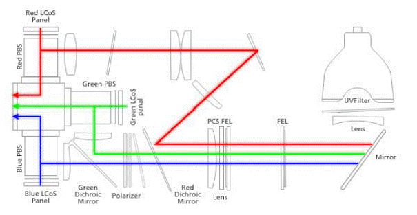 Diese Kinotechnik hat LG kompromisslos in den CF3D Heimkinoprojektor übertragen: Es handelt sich hierbei gleichsam um „zwei Projektoren in einem“, denn zwei komplette Lichtwege (2 Lampen, 6 LCOS Panels usw.) erzeugen jeweils eines der beiden Perspektivbilder, die anschließend durch ein Prisma überlagert werden und gleichzeitig den Projektor durch eine gemeinsame Projektionsoptik verlassen, fast wie im Kino!