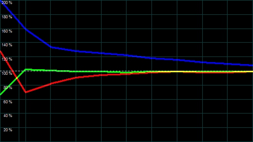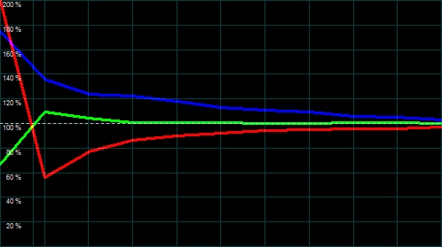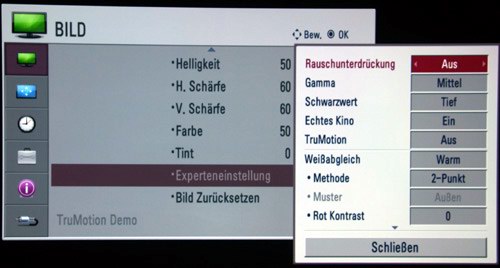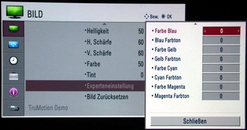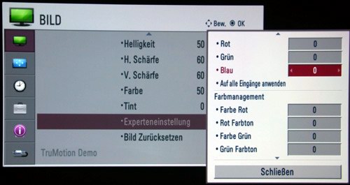 Mit „TruMotion“ wird die 120Hz-Zwischenbildberechnung aktiviert, für den notwendigen Weißabgleich werden neben diversen Werkspresets entweder die üblichen Gain / Bias Parameter angeboten, oder eine Art Gamma-Equalizer in mehreren Stufen, was eine noch genauere Justage ermöglicht.