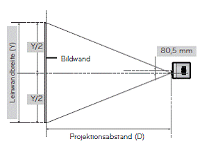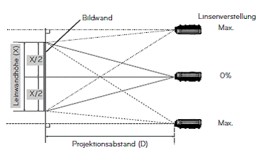 Um bis zu 50% der Bildhöhe kann mit dem Lensshift das Bild vertikal verschoben werden, dies gibt mehr Flexibilität in Hinblick auf Raumhöhe und Decken, bzw. Wandhalterungen.