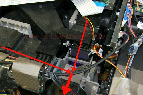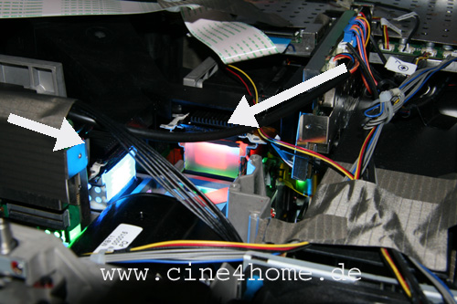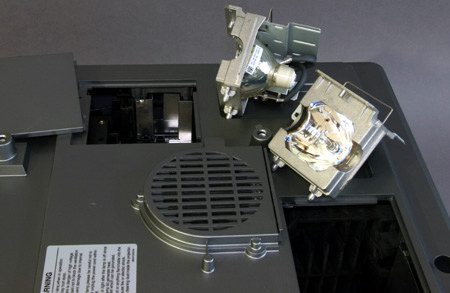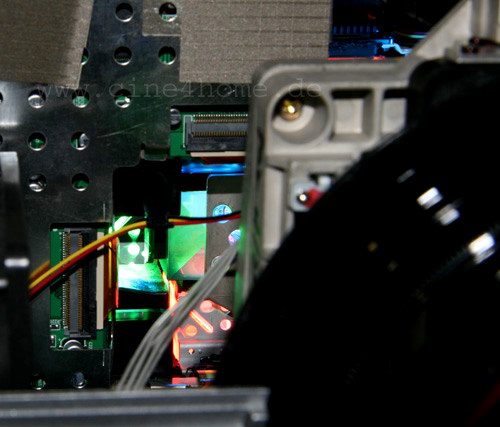Eine Lampe befindet sich am hinteren Ende des Projektors, die andere „über Eck“ an der Seite. Hier kann man schon erkennen, wie aufwendig sich der technische Aufbau gestaltet, denn bei UHP-Lampen handelt es sich um Bauteile mit relativ großen Werkstoleranzen, die im Falle des CF-3D aufeinander abgestimmt werden müssen, doch dazu mehr im zweiten Teil dieses Testspecials.