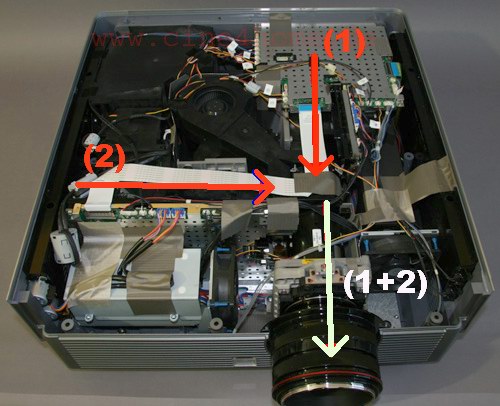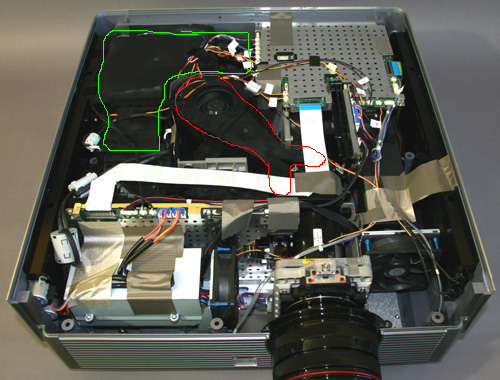 Unsere Skizze zeigt, wie auch die Luftkanäle im Gerät strikt voneinander getrennt sind, aber nicht zwischen den Lichtwegen, sondern zwischen Lichtquellen und Lichtwege: Der rot markierte Kanal kühlt die 6 SXRD Panels, der grüne die beiden leistungsstarken UHP Lampen sowie die Signalelektronik. Damit ist ein optimaler Staubschutz und eine effektive Kühlleistung gegeben.