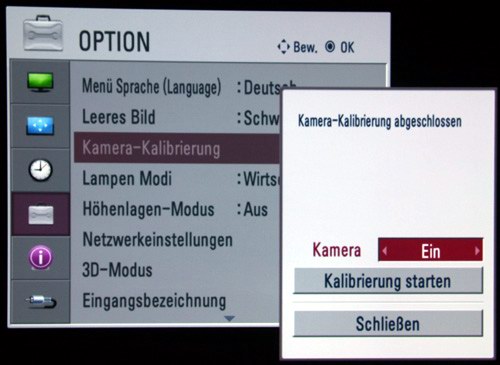Wie bereits im technischen Teil erläutert, besteht eines der Hauptprobleme einer 3D-Doppelprojektion mit passiven Brillen darin, die Bilder beider Projektoren nicht nur weitgehend Deckungsgleich abzubilden, sondern sie auch in Helligkeit und Farben aufeinander abzustimmen. Um auch in dieser Hinsicht einen maximalen Komfort zu bieten, hat LG ein automatisches Abgleichsystem im Projektor integriert. Aktiviert wird es im Options-Menü unter dem Punkt „Kamera Kalibrierung“:
