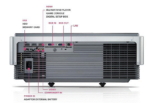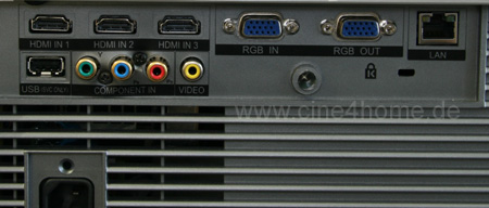 Wie man den Fotos entnehmen kann, befinden sich die Anschlüsse allesamt an der Rückseite des Projektors und sind mehr als grußzügig dimensioniert: Gleich drei (3D fähige) HDMI Anschlüsse bietet der CF3D, eine USB Buchse zur direkten Einspeisung von Bilddaten von Festplatte oder anderen Speichermedien stehen ebenso zur Verfügung, wie ein LAN-Anschluss: Moderner geht es derzeit kaum.