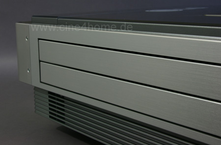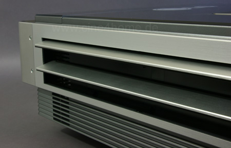 Im ausgeschalteten Zustand sind die massiven Metalllamellen geschlossen und schützen so das Gerät effektiv vor unerwünschtem Wohnzimmerstaub. Schaltet man den Projektor jedoch an, werden sie elektrisch geöffnet und wecken unweigerlich Assoziationen zu den Landeklappen eines Flugzeuges, wenn es die Landeklappen erreicht.