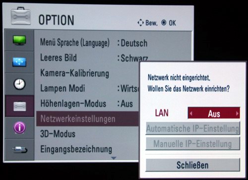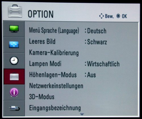Auch die Kategorie „Option“ bietet Grundeinstellungen wie Sprache und Farbe bei fehlender Signalquelle. Zudem erfolgen hier die Wahl der Lampenleistung (Hoch oder Eco) sowie die Aktivierung des gewünschten 3D-Modus.