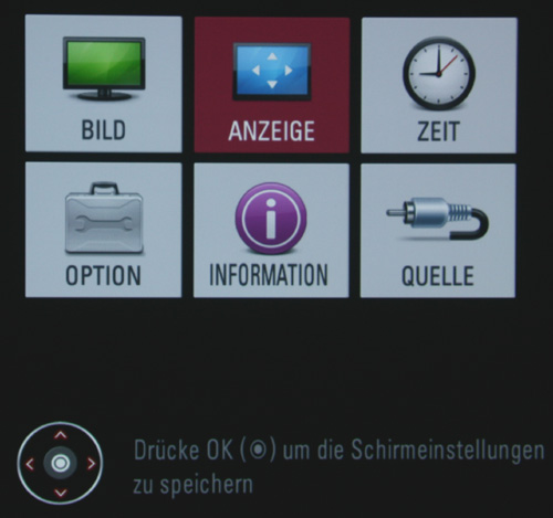 So komplex und aufwändig sich der LG CF3D in seiner Ausstattung und technischem Aufbau darstellt, so überraschend ist sein spartanisches Bediensystem, das nahezu ohne Veränderungen von den Budget-Projektoren und Fernsehern aus selbigem Hause übernommen wurde. Dieses übliche LG-Konzept bietet nur eine grobe Strukturierung, die durch überproportional große Icons gekennzeichnet ist