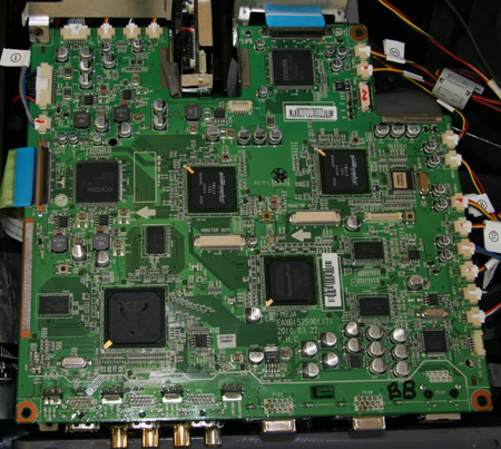 Wie zu erwarten finden sich auf der gemeinsamen Platine viele elektronische Bauteile doppelt, so z.B. die Signaltreiber für die SXRD-Panels (oben auf der Platine). Interessant ist der LG eigene Baustein namens „XD-Engine“, im Foto der große Chip unten links: Er sorgt unter anderem für die Zwischenbildberechnung, denn tatsächlich bietet der LG Projektor als einer der weltersten Projektoren tatsächlich eine passive 3D Projektion mit 120Hz Zwischenbildberechnung.