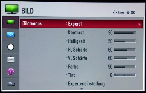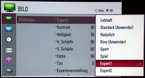 Im „Bild“-Menü werden die üblichen Grundparameter der Bildkalibrierung geboten, lobenswert ist die Teilung der Schärfe in horizontaler und vertikaler Richtung. Ergänzt wird das System durch verschiedene Werkspresets, die unter „Bildmodus“ abgerufen werden können: