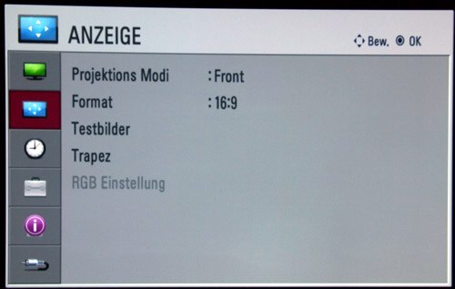 Die zweite Hauptkategorie „Anzeige“ dient zur Einrichtung des Projektors (z.B. Front oder Rückprojektion / Decken oder Tischmontage) und wird im Alltag nicht weiter benötigt.