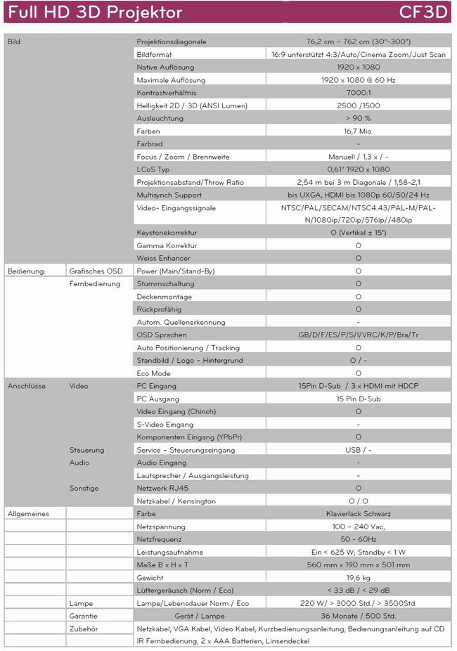 Der LG-CF3D ist derzeit die kompakteste und am besten durchdachte 3D-Lösung, wenn es um eine möglichst kompromisslose Projektion in den eigenen vier Wänden geht. Seine Anlehnung an die originale Kinotechnik (Passive Polarisationsbrille ohne Shutter-Flimmern) erzeugt ein authentisches 3D-Erlebnis, das einen wirklich in das Filmgeschehen versetzt. Auch für Spiele und TV in drei Dimensionen ist er besser geeignet, da er rund siebenmal heller ist, als aktuelle Konkurrenzmodelle.