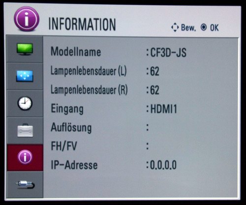 Die vorletzte Kategorie „Information“ unterrichtet schließlich über das eingespeiste Bildsignal, die Lampenlaufzeit sowie die IP-Adresse des LANs, Einstellungen kann man hier aber nicht vornehmen.