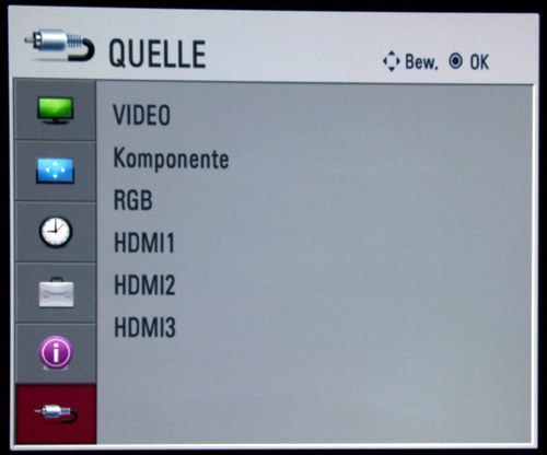 Es verbleibt das „Quellen“-Menü, mit dem die einzelnen Eingänge angesteuert werden können.