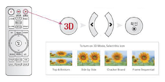 Entscheidend ist die „3D“-Taste oben rechts, denn mit ihr wird das spezielle 3D-Menü des CF3D auf die Leinwand gerufen, mit der die notwendige DeCodierung des 3D Signals gewählt wird.