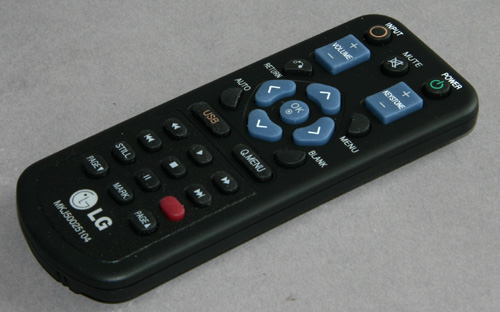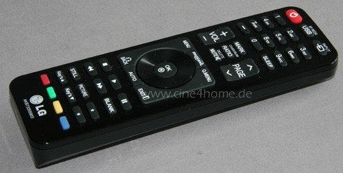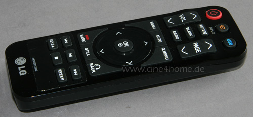Wenn ein Projektor so vielseitige eingebaute Multimedia-Anwendungen bietet, dann muss auch die Fernbedienung entsprechend umfangreich angepasst sein. Das haben die LG-Ingenieure auch erkannt und dem HW300Y einen vollwertigen Infrarotgeber beigelegt, der an diejenigen von TVs erinnert. Mit dem Nummernfeld, dem Steuerkreuz und den standardisierten Wiedergabefunktionen hatten wir in unserem Test keine Bedienprobleme.