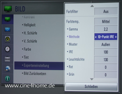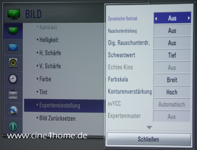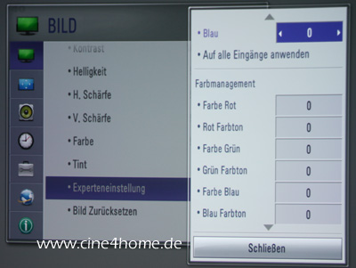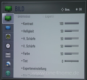 Beeindruckend ist das Untermenü „Experteneinstellung“: Wie bei einem hochpreisigen Heimkino-Beamer kann sich der versierte Großbildfan an diversen Profi-Einstellparametern austoben: