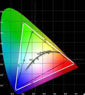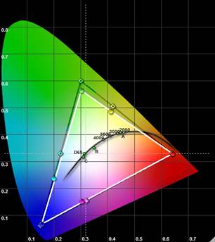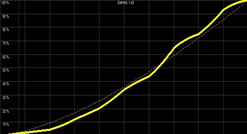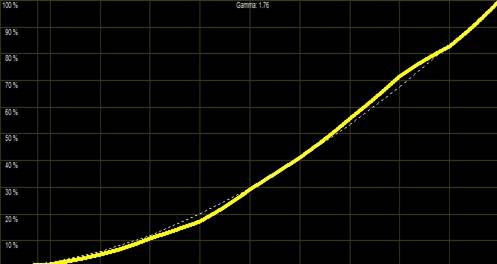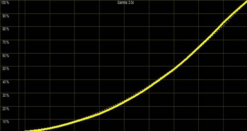 Obige Messung entspricht tatsächlich der Werkseinstellung ohne jegliche nachträgliche Kalibrierung. Selbst heimkinooptimierte Geräte bieten selten eine solche Perfektion ab Werk. Auch das Gamma liegt nun nahe an der Videonorm, auch wenn es sie nicht ganz trifft: