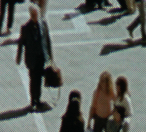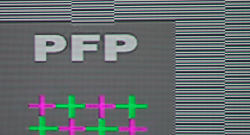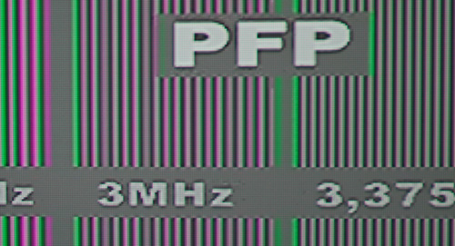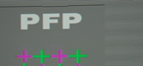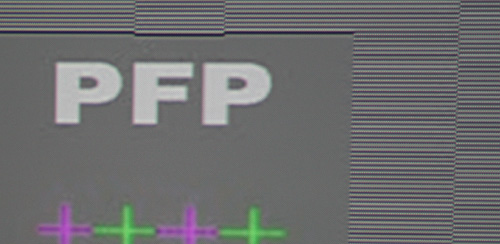 Im Screenshot oben sehen wir das Pixellayout in Verbindung mit einer Video-Detailaufnahme, fotografiert aus nächster Nähe. Wir zu erwarten, zeigen sich deutliche Vorteile in schrägen Kanten, horizontale und vertikale Kontrastübergänge wirken hingegen leicht „ausgefranst“.