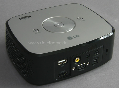 Die Anschlussseite ist nahezu identisch zum HS200G: HDMI, VGA und Composite für externe Bildquellen sowie eine USB-Buchse zur Einspielung von MP3s, JPEGs und DIVX Files per externem Speicher. Auch hier sorgt ein integrierter Lautsprecher auch ohne Anlage für Ton, per Klinkenanschluss können aber auch externe Audiosysteme angeschlossen werden.