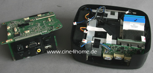 Auf der Unterseite findet sich die „Kraft der zwei Herzen“, bestehend aus der LG-eigenen XD-Engine (bekannt durch die TVs) für die Signalverarbeitung und einem Texas Instruments DDP zur Ansteuerung des DMD Chips.