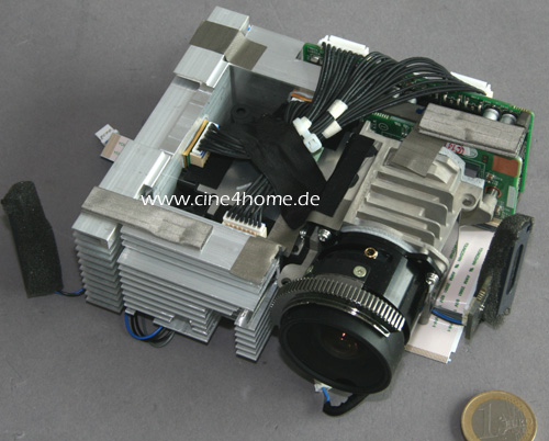 Unter dem Mainboard findet sich schließlich die komplette Lightengine, die wir für eine weitere Analyse ebenfalls ausgebaut haben. Im Bild dient die Euro-Münze als Größenvergleich, an dem man erkennt, wie beeindruckend klein dieser DLP-Projektor tatsächlich ist.