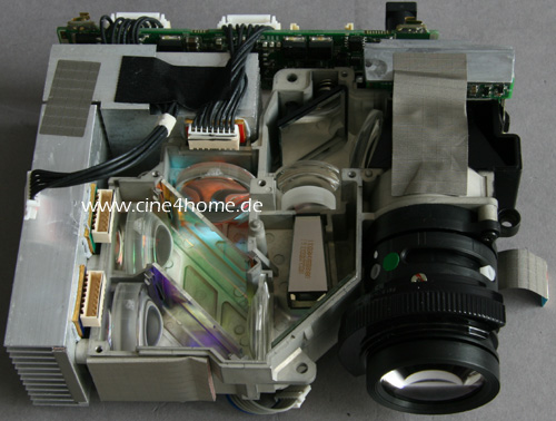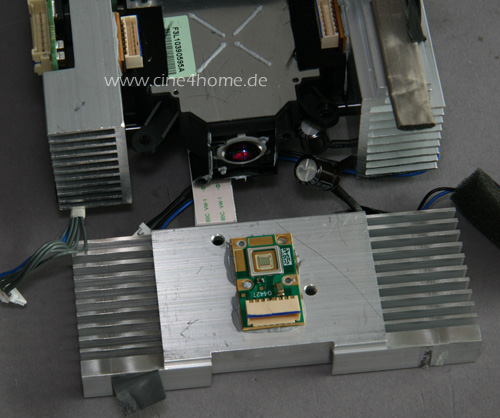 Für uns neu ist die innere Positionierung der LEDs: Statt nebeneinander wie eine Ampel, sind sie hier nach LCD-Vorbild rechtwinklig zueinander positioniert und ihr jeweiliges Licht wird durch ein Kreuz aus dichroitischen Spiegeln auf den DMD gelenkt. Jede der drei Hochleistungs-LEDs wird durch große Kühlkörper passiv von der Rückseite gekühlt (unterstützt von aktiven Lüftern).