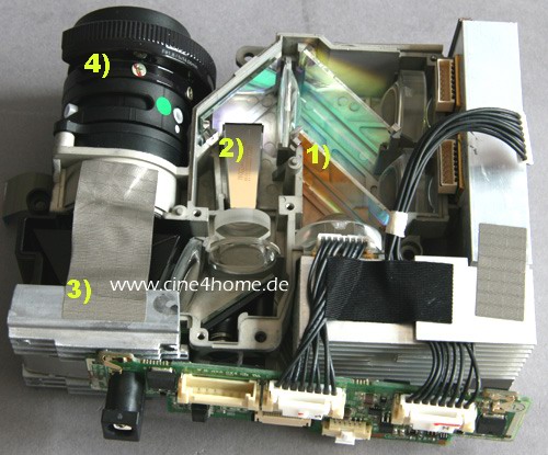 Im 45° Winkel montierte dichrotische Spiegel (1) leiten das Licht weiter in einen gemeinsamen Lichtweg, in der es von einem Spiegeltrichter (2) im wahrsten Sinne des Wortes „eingefangen“ und gebündelt wird. Von dort aus wird es weiter auf den DMD-Chip (3) gelenkt, der das fertige Bild schließlich durch die Projektionsoptik (4) auf die Leinwand reflektiert. Da alle Komponenten einseitig von hinten gekühlt werden können, ist der gesamte Lichtweg gut gekapselt und staubsicherer, als andere Techniken.