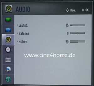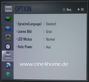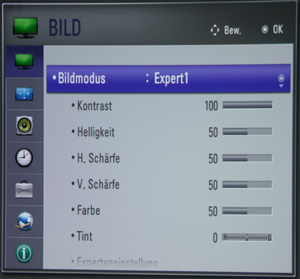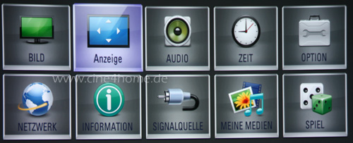 Auch die On-Screen Menüs zeigen die von LG bekannte Struktur: Auf der obersten Ebene geben zehn große Icons mit Textumschreibung einen Überblick über die Hauptkategorien.