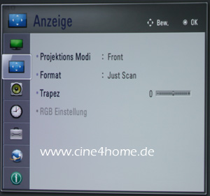 Die Menüstruktur entspricht der größeren Projektoren oder auch TVs aus selbigem Hause. Übersichtlich nach Hauptkategorien und Symbolen sind alle relevanten Parameter gruppiert und leicht zu finden.