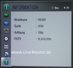 „Last but not least“ verbleibt der “Information”-Screen, der den Anwender mit allen Informationen zum zugespielten Bildsignal versorgt.