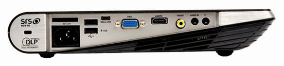 Das Anschlussboard zeigt direkt, dass es sich um einen Projektor der „neuen Medien“ handelt. Statt klassischer Bildeingänge verfügt er über einen SDKarten-Slot, USB-Buchsen verschiedener Größen und einen HDMI-Bildeingang mit MHL-Unterstützung.