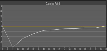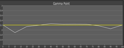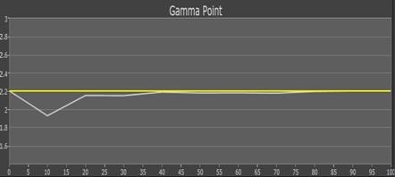 Auch das Gamma zeigt bestenfalls eine grobe Annäherung an die Videonorm, dunkle und mittelhelle Bildpartien werden deutlich zu hell abgebildet wodurch die Bildplastizität leidet und einen ausgewaschenen Charakter erhält. Mangels jeglicher Einstellparameter ist eine Korrektur unmöglich.