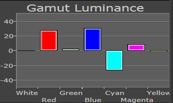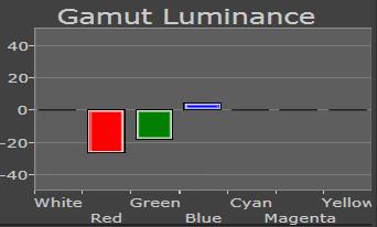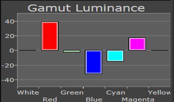 Allein die Helligkeiten der Grundfarben Rot & Grün liegen unter ihren Sollwerten (im Verhältnis zu Vollweiß), doch das ist gar nicht so ungünstig, wie man auf den ersten Blick annehmen könnte. Denn durch die etwas zurückgenommenen Helligkeiten wird der intensiver wirkende Charakter des LED Spektrums im Bild ausgeglichen. Im Sichttest wirkte der LG PF80G verblüffend natürlich und zeigte keineswegs die LED-typischen „Bonbon“-Farben.