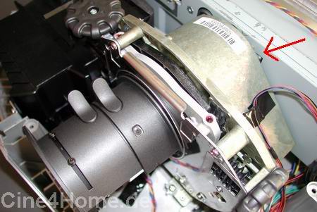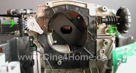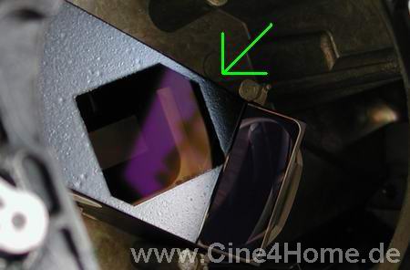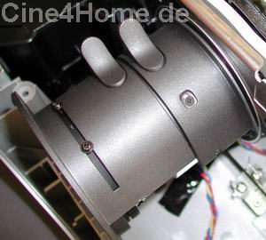 Im Bild oben ist zu erkennen, wir die großen Schnecken der Lens-Shift-Räder den Fassungs-Rahmen der Optik als Einheit verschieben.