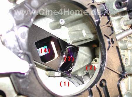 Unterhalb der Optik gelangt das Licht nach Passieren des Farbrades und verschiedener Integrator-Linsen in den „DMD-Raum“ (1). Von hier wird es über einen Spiegel in eine spezielle Optik reflektiert (2), die gleichzeitig als halbdurchlässiger Spiegel das Licht direkt auf den DMD-Chip leitet (3). Der DMD-Chip erzeugt hier nun das eigentliche Bild, das anschließend senkrecht durch das Prisma in die Optik gelangt (4).