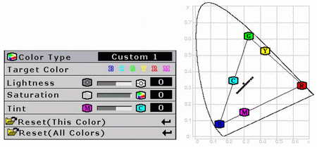 Tatsächlich können hier alle Primär- und Sekundärfarben völlig unabhängig voneinander in ihren Eigenschaften vom Nutzer beeinflusst werden. Die grafische Darstellung als Farbsegel ist dabei zweckmäßig und zugleich sehr anschaulich. Besser geht es kaum. Ein ähnlich aufgebautes Farbmenü ist uns derzeit nur von den Yamaha DPX1000/1100 Geräten bekannt, die aber preislich in einer anderen Liga spielen. Mit Hilfe dieses speziellen Farbmanagements kann der versierte Anwender die Farbparameter optimal auf jede Anwendung oder Videonorm anpassen. Die erzielbaren Ergebnisse sprechen hier für sich:
