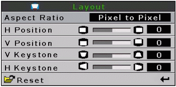Die „Aspect Ratio“ Funktion bietet selbsterklärend verschiedene Bildformate zur Auswahl, sie ist auch direkt per Fernbedienung anwählbar. Mit „H und V-Position“ kann ferner der Bildausschnitt verschoben werden. Obwohl der Projektor einen doppelten Lensshift hat, bietet er in diesem Menü noch eine doppelte digitale Trapezkorrektur ("Keystone"). Spätestens mit dieser Funktion lässt sich nahezu jede Projektorenposition realisieren.