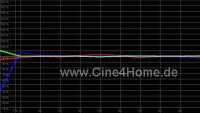 Wie im Diagramm oben zu erkennen, ist der Projektor in nahezu allen Helligkeitsbereichen perfekt auf die D65-Norm abgestimmt. Das Bild zeigt weder zuviel Grün, Rot oder Blau. Unsere Messung ist zudem wiederholt ein Beweis dafür, dass bei hochwertigen Komponenten die übrige „Kette“ einen geringen Einfluss auf die Messergebnisse hat.
