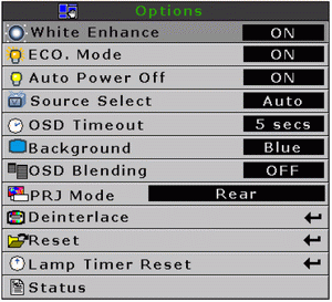 Die „White Enhance“ Option ist die für DLP nahezu obligatorische Weißbetonung. Wird sie aktiviert, so erscheinen helle Bildbereiche noch einmal deutlich verstärkt, der On / Off Kontrast wird erhöht. Der „Eco-Modus“ beeinflusst die Lampenhelligkeit und die damit verbundene Lüfterlautstärke. Auch mit aktiviertem Economy Modus erzeugt der NHT-576 genügend Bildhelligkeit für Bildbreiten bis 3m. Eine praktische Funktion ist der automatische „Source Select“, durch den der Projektor selbsttätig erkennt, an welchem seiner Eingänge ein Bildsignal anliegt und diesen dann direkt auswählt. Bei Bedarf kann diese Funktion deaktiviert werden. Die nächsten drei Funktionen, „OSD-Timeout“, „Background“ und „OSD-Blending“ erlauben es, die grafische Bedienoberfläche auf den persönlichen Geschmack abzustimmen. „PRJ-Modus“ dient zur Auswahl der verwendeten Projektoren-Installation, Decken- bzw. Tischmontage. Auch Rückprojektion ist möglich. Eine besonders wichtige Funktion ist die „Deinterlace“-Rubrik. Sie dient zur Konfiguration eingehende Halbbild-Signale. Auf sie gehen wir im Laufe des Bildtests noch genauer ein. Als letzte und besonders praktische Funktion bleibt der „Status“. Hier kann abgelesen werden, was für ein Eingangssignal anliegt.