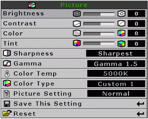 Die ersten vier Parameter umfassen die gängigen und jedem bekannten Funktionen „Brightness“, „Contrast“, „Color“ und „Tint“. Mit ihnen werden Weiß- und Schwarzpegel sowie die Farbsättigung beeinflusst. Auch die „Sharpness“-Funktion ist selbsterklärend. Die nächsten drei Funktionen umfassen die fortgeschrittenen Bildparameter wie „Gamma“, „Color Temp“ und „Color Type“. Auf sie gehen wir im Laufe unsers Bildtests noch genauer ein. Um Anfängern einen einfachen Zugang zu der für die jeweilige Anwendung beste Einstellung zu gewähren, stellt der Projektor mit der Funktion „Picture Setting“, drei verschiedene Werks-Einstellungen zur Auswahl, „Normal“, „Bright“ und „Movie“. Zudem stehen zwei Speicherbänke zur Verfügung, die das direkte Abspeichern eigener Einstellungen erlauben. Sollte man bei der Kalibrierung den Faden verloren haben, so kann der Werks-Ursprungs-Zustand jederzeit mit der „Factory Reset“ Funktion wiederhergestellt werden.