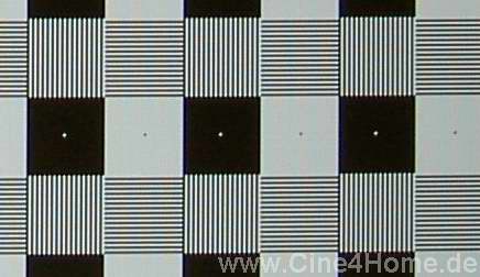 Bei der Beurteilung der optischen Schärfe half uns ein sehr sinnvolles internes Testbild des Projektor-Service-Menüs. Auf Knopfdruck kann hier ein Linienmuster aufgerufen werden, das genau auf die Auflösung des DMD-Panels angepasst ist und somit in seiner Schärfe allein der Optik unterliegt: