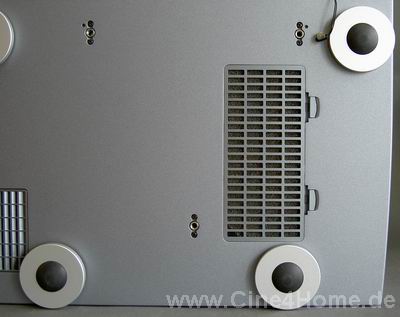 Es verbleibt nur ein kleiner Wehrmutstropfen: Ausgerechnet der Luftfilter, der von Zeit zu Zeit gereinigt werden sollte, befindet sich auf der Unterseite des Projektors. Dadurch ist bei Deckenbetrieb stets eine Demontage von der Halterung unumgänglich. In Anbetracht des ansonst hervorragenden Kühlsystems sei dies den Konstrukteuren aber verziehen. Um den weiteren Aufbau des Projektors näher zu untersuchen, haben wir wie immer einen Blick in das Geräteinnere geworfen. Auch hier waren wir im höchsten Maße beeindruckt: