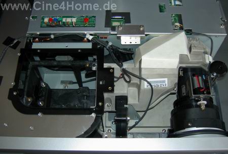 Wie schon der kleine Bruder HC900 ist auch der HC2000 von innen geradezu perfekt verarbeitet. Der Aufbau ist modular, alle Komponenten sind klar voneinander getrennt und durch dicke Schutzbleche zusätzlich abgeschirmt, besser geht es kaum. Im Bild oben ist deutlich zu erkennen, wie übersichtlich und aufgeräumt der HC2000 wirkt. Auch der Lichtweg des Projektors ist mehr als vorbildlich konstruiert. Die gesamte Einheit inklusive Farbrad und DMD-Chip ist komplett verkapselt. Somit ist maximaler Staubschutz gewährleistet.