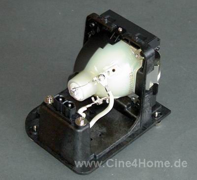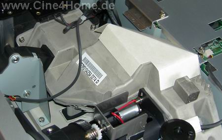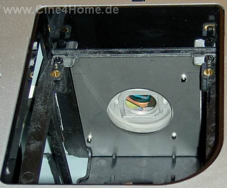 Nach Lösen zweier weiterer Schrauben kann das Lampenmodul bequem per Drahtgriff gewechselt werden. Ein großer Vorteil dieser oberseitigen Platzierung des Schachtes ist, dass hierfür der Projektor nicht aus seiner Deckenhalterung genommen werden muss. Nach dem Herausnehmen der Lampe erhält man auch einen kleinen Einblick auf den Beginn des Lichtweges des HC2000. Wie bei jedem DLP Projektor steht auch hier das Farbrad am Anfang in direkter Nähe zur Lichtquelle.