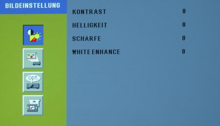 Die ersten drei Funktionen sind bekannt und nahezu selbsterklärend: „Kontrast“ und „Helligkeit“ dienen zum Abgleich des Weiß- bzw. Schwarzpegels, „Schärfe“ zur Signalanpassung an die Videoquelle. Für DLP-Projektoren typisch ist die „White-Enhance“ Funktion: Durch das zusätzliche Nutzen der Übergänge zwischen den einzelnen Farbsegmenten des Farbrades für die Bilddarstellung, kann die Maximal-Helligkeit und damit der Kontrast des Projektors deutlich gesteigert werden. Bei analoger Zuspielung kommen zu obigen Funktionen noch „Farbe“ (Farbsättigung) und „Tint“ (für NTSC) hinzu.
