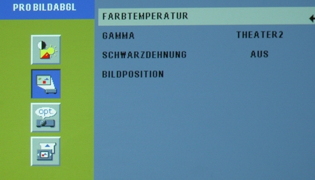 Im weiterführenden Bildmenü (Rubrik2) lassen sich speziellere Bildparameter beeinflussen, die für eine Original-getreue Kinoreproduktion unerlässlich sind: Besonders wichtig ist dabei die Funktion „Farbtemperatur“. Mit ihr lassen sich die Farben auf die erforderliche Videonorm anpassen. Verschiedene Presets stehen dabei zur Auswahl: